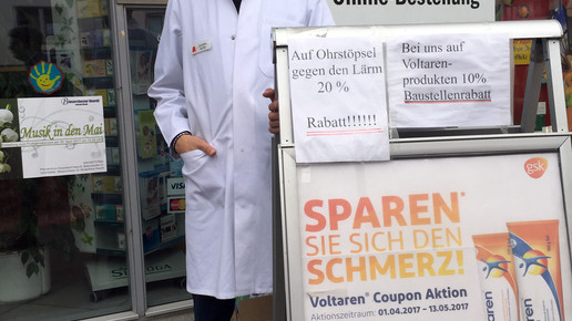 Manchmal hilft im Leben nur Humor. Zum Beispiel, wenn vor der eigenen Apotheke plötzlich eine riesige Baustelle eröffnet wird. Rami Itani, Inhaber der Stern-Apotheke in Düsseldorf, hat für seine stressgeplagten Kunden zwei Sonderangebote mit Lächelfaktor: Auf Ohrstöpsel gewährt er 20 Prozent Rabatt, wer Voltaren-Produkte kauft, spart 10 Prozent.