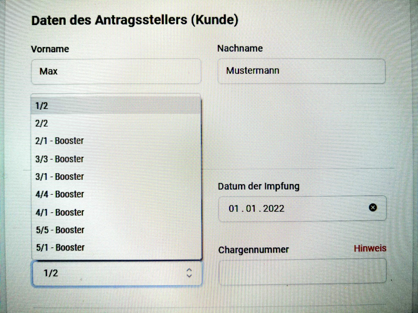 Geimpfte Genesene die die erste Auffrischimpfung erhalten: Eintrag als 2/1-Booster (Schieberegler betätigen)