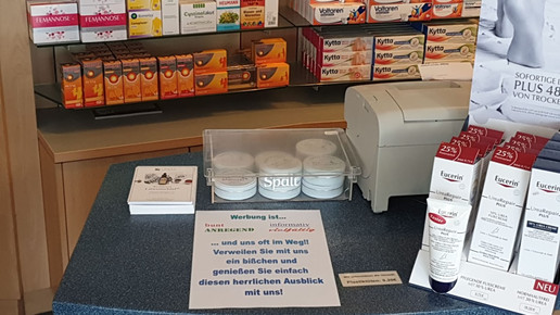 Per Poster wirbt Knoke im Schaufenster für den Ausblick aus seiner Apotheke: „Werbung ist bunt, anregend, informativ, vielfältig … und uns oft im Weg“, heißt es auf dem Plakat. „Verweilen Sie mit uns ein bisschen und genießen Sie einfach diesen herrlichen Ausblick mit uns!“ Die Kunden reagierten darauf und man treffe sich in den Wintermonaten zuweilen mit einer Tasse Kaffee zum Sonnenaufgang in der Offizin, so Knoke.