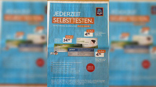 Auf einer ganzen Seite wirbt Aldi Süd in der Eßlinger Zeitung für das Laientest-Sortiment: „Jederzeit Selbsttesten“, schreibt der Discounter. „Dein Corona-Schnelltest für zu Hause.“ Abgebildet sind die Diagnostika Aesku.Rapid, Boson und Hotgen. Die beiden letzteren werden in Einzelpackungen für 4,95 Euro angeboten, der Aesku.Rapid-Test in der 5er-Packung für 24,99 Euro.
