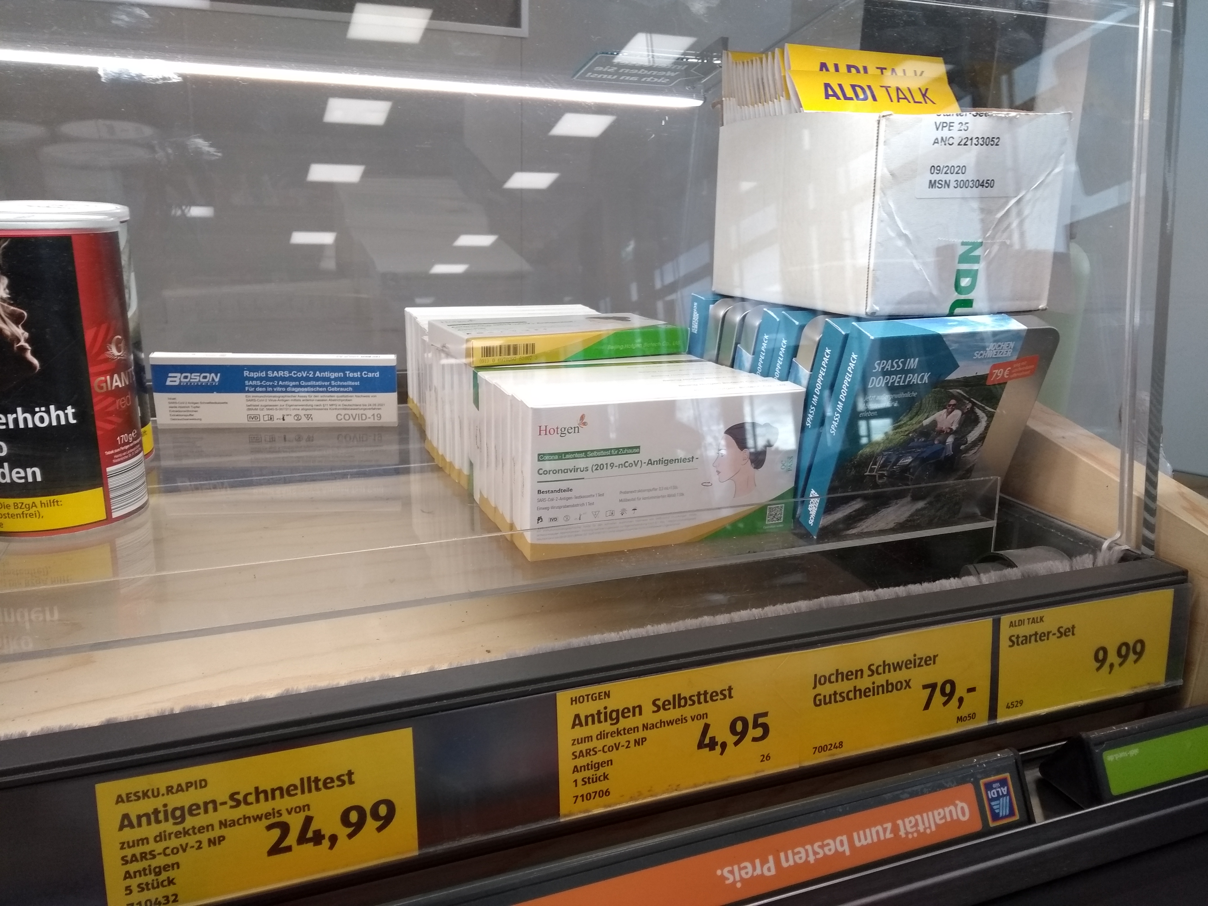 Viele Apotheken warten sehnlichst auf die Lieferung von Antigen-Schnelltest für ihre Kund:innen. Die Laientests sind rar. Die Lieferketten der Discounter scheinen zu funktionieren. Als eine Pharmazeutin in ihrer Tageszeitung eine große Anzeige von Aldi Süd gleich für verschiedene Schnelltests sah, staunte sie nicht schlecht.