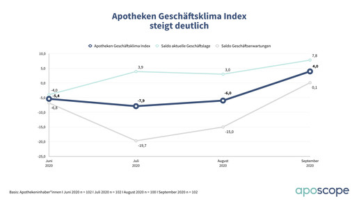 Die wirtschaftlichen Folgen der Corona-Pandemie haben auch in Apotheken teilweise drastische Einbußen zufolge gehabt. Doch der im Rahmen des Apothekenbarometers von aposcope erhobene „Apotheken Geschäftsklima Index“ (AGI) für September zeigt, dass die Zuversicht in die Offizin zurückkehrt. Auch die Erwartungen für die zukünftige Geschäftsentwicklung haben sich deutlich verbessert.