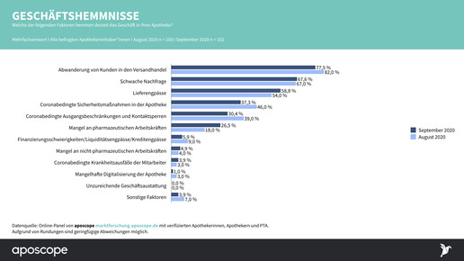 Zu den größten Geschäftshemmnissen zählt weiterhin die Abwanderung in den Versandhandel (78 Prozent). Mehr Sorgen bereiten den Inhabern Lieferengpässe als Herausforderung für die Apotheke, der Anteil stieg von 54 auf 59 Prozent.
