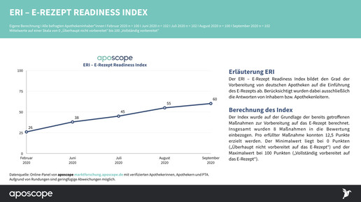 Getrieben von den Entwicklungen im Zuge der Corona-Pandemie hat sich auch der von aposcope erhobene E-Rezept Readiness Index (ERI) weiter gesteigert und liegt inzwischen bei 60 von 100 möglichen Punkten. Der ERI spiegelt anhand von bereits getroffenen Maßnahmen der befragten Inhaber den Grad der Vorbereitung auf die Einführung des E-Rezepts wider. Vor einem Monat lag der Index bei 55 Punkten.