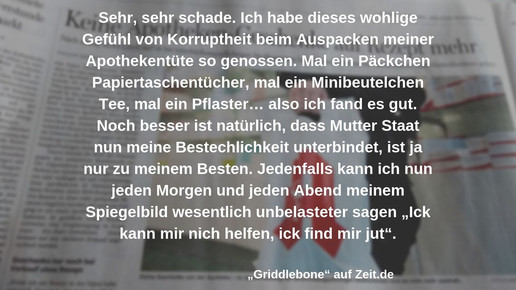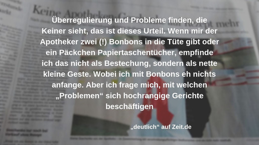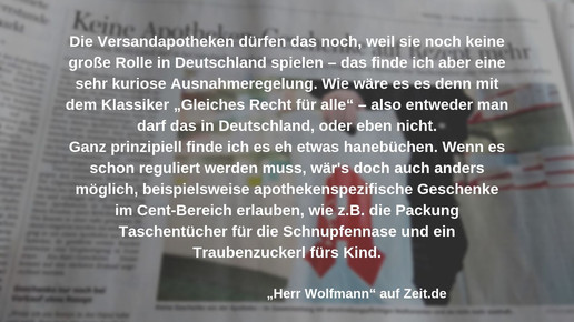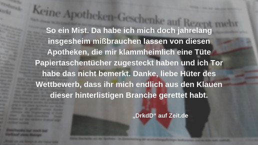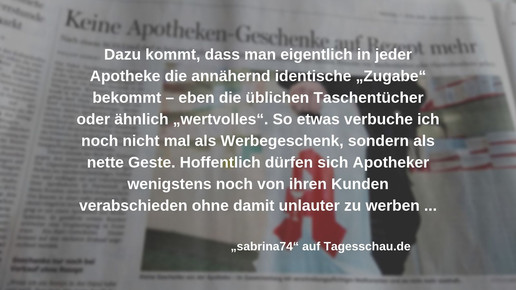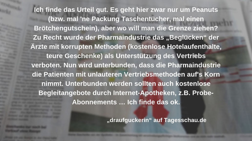 Nur an einer Stelle bezieht sich der BGH auf Taschentücher, als er im Ofenkrusti-Verfahren die Entscheidung der Vorinstanz bestätigt. Das Oberlandesgericht Frankfurt (OLG) habe zurecht angenommen, dass ein Brötchen-Gutschein den Erwerb eines Arzneimittels günstiger erscheinen lasse. Die Auslobung eines konkreten Sachwerts sei sogar ein größerer Anreiz als ein Gutschein über einen entsprechenden Centbetrag. „Sofern die Sachangabe für den Kunden einen wirtschaftlichen Wert habe, an den Erwerb des Arzneimittels gekoppelt sei und nicht nur – wie etwa die Überlassung eines Traubenzuckers oder einer Packung Taschentücher – als Ausdruck von Kundenfreundlichkeit aufgefasst werde, unterlaufe die Apotheke damit ebenfalls die Preisbindung.“ Der BGH zitiert hier die Vorinstanz, macht sich mit der Zurückweisung der Revision das Urteil aber auch zu eigen: „Diese Beurteilung hält der rechtlichen Nachprüfung stand.“
