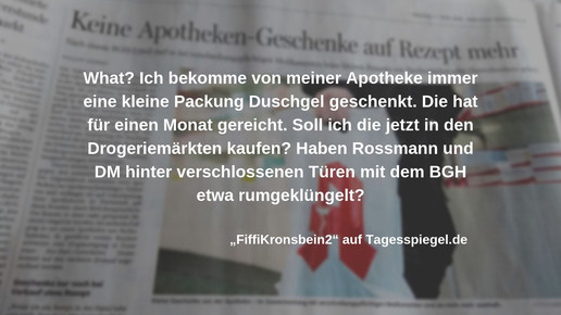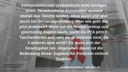 Allerdings machen die Karlsruher Richter klar, dass es aus ihrer Sicht keinerlei Bagatellschwelle mehr gibt, sobald es um die Abgabe preisgebundener Arzneimittel geht. Auch der Gutschein im Gegenwert von 30 Cent verstoße gegen das Preisrecht. Der Brötchen-Gutschein sei auch kein „handelsübliches Zubehör“ oder „handelsübliche Nebenleistung“. Maßgeblich dafür sein eine „funktionale Beziehung zur Hauptware“.