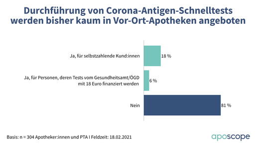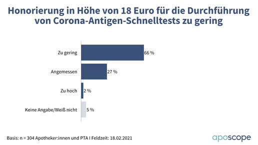 Für die Bürger:innen sollen die Schnelltests kostenlos sein, die Apotheken sollen laut aktuellen Plänen 18 Euro erhalten – 9 Euro für das Testmaterial und 9 Euro für die Durchführung und Attesterstellung. Eine Mehrheit von 66 Prozent empfindet diese Honorierung als zu gering, unter den Inhabern sind es sogar 76 Prozent. Die Preisvorstellungen bewegen mehrheitlich bei 25 bis 35 Euro, etwa jeder Vierte hätte gern noch mehr, 14 Prozent wären auch mit einer Vergütung von 20 bis 25 Euro zufrieden.
