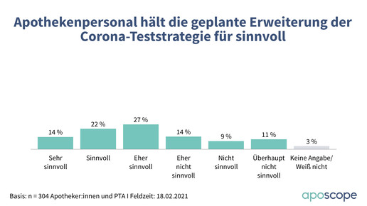 Unter den Angestellten ist die Bereitschaft zwar insgesamt höher, die Entscheidung liegt aber am Ende bei Chefin oder Chef. Unter allen 304 Befragten bei aposcope gab etwa ein Viertel (26 Prozent) an, solche Tests durchführen zu wollen – obwohl insgesamt eine Mehrheit von 63 Prozent die Erweiterung der Teststrategie insgesamt für sinnvoll hält.