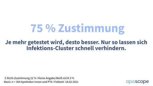 Einig sind sich fast alle in der Apotheke in einer Frage: 91 Prozent stimmen der Aussage zu, dass die Teams bei der Corona-Impfung priorisiert werden müssten, wenn in Apotheken massenhaft getestet wird. Auch unterschreiben 75 Prozent die Aussage: Je mehr getestet wird, desto besser, da sich nur so Infektions-Cluster schnell verhindern ließen.