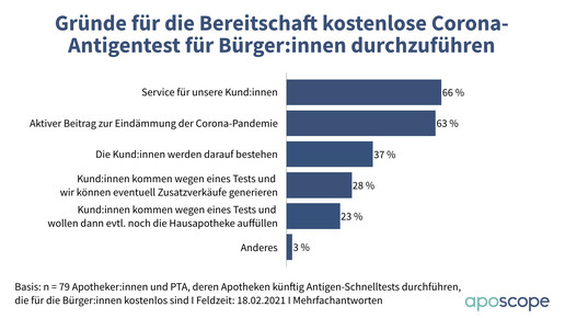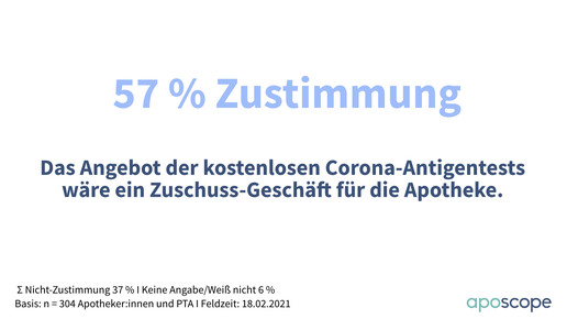 Die Option, mit dem vorgesehenen Honorar für die Bürger:innen kostenblose Tests durchzuführen, wäre nach Einschätzung von 57 Prozent eine Zuschussgeschäft für die Apotheken. Die Inhaber:innen sind davon sogar mit deutlicher Mehrheit überzeugt (76 Prozent).