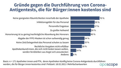 Weitere Gründe für eine Absage sind die Infektionsgefahr für das Personal (59 Prozent), personelle Engpässe (57 Prozent), zu großer Aufwand (50 Prozent) und eine zu geringe Honorierung (49 Prozent). Aber auch die laufende Maskenausgabe (34 Prozent) und die fehlende Zeit das Personal zu schulen (33 Prozent) werden genannt. Eher gering ist die Sorge, dass andere Kund:innen der Apotheke fernbleiben, aus Angst sich bei Testpersonen anzustecken (14 Prozent).