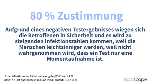 Doch die Apotheker:innen und PTA sehen auch die Gefahr in dieser Strategie: 80 Prozent befürchten, dass sich Betroffene nach einem negativen Testergebnis in Sicherheit wiegen und es deshalb zu steigenden Infektionszahlen kommen könnte. Und 88 Prozent rechnen damit, dass sich nicht jeder positiv Getestete auch tatsächlich in Quarantäne begeben wird.