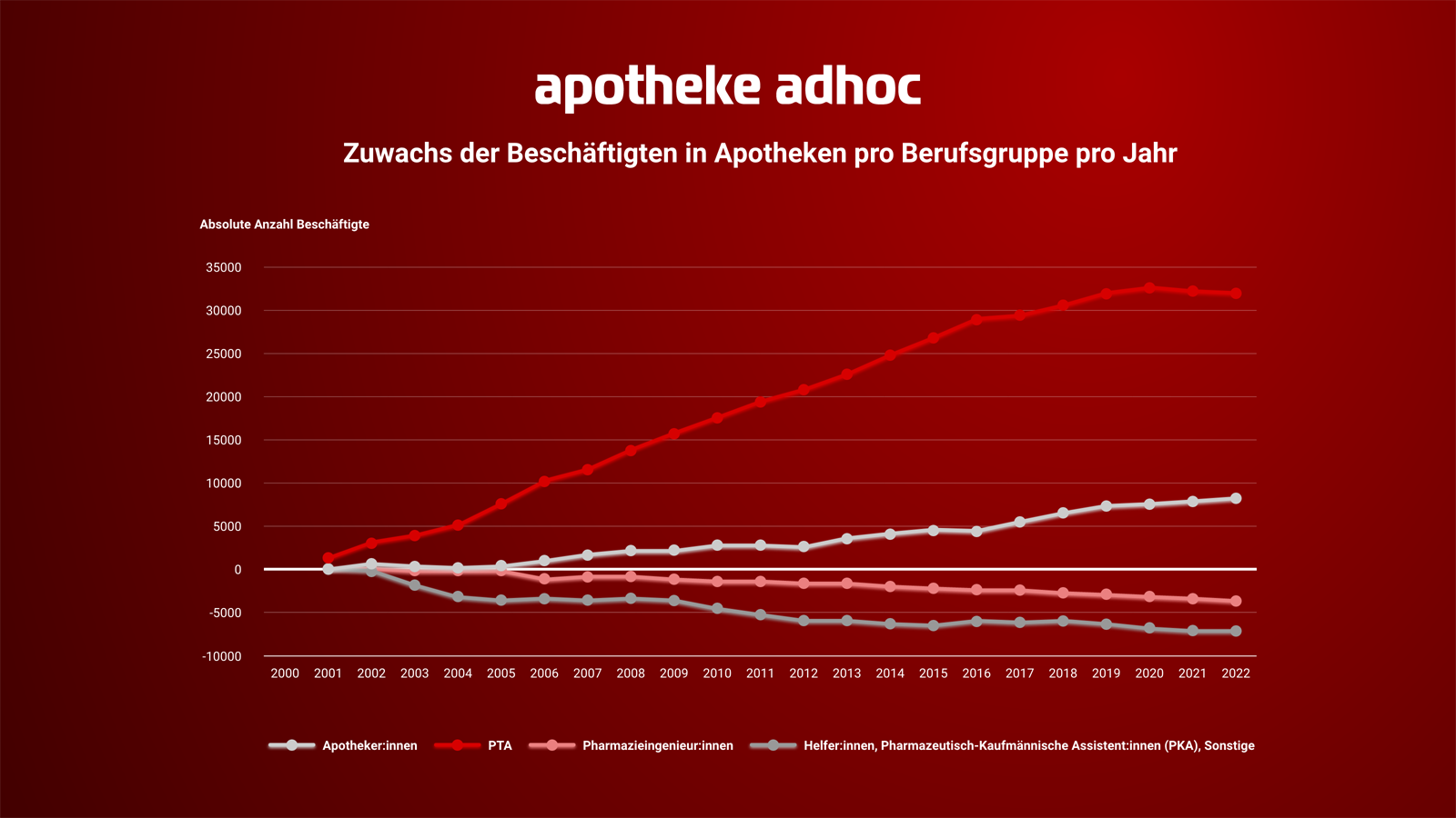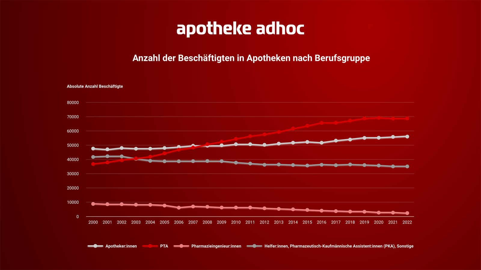 Rund 167.600 Menschen arbeiten laut Gesundheitsberichterstattung des Bundes (GBE) in den rund 18.000 Apotheken; Reinigungskräfte, Fahrer und andere externe Kräfte nicht mitgezählt. Obwohl die Zahl der Betriebe seit 2008 abnimmt und der Trend sich seit 2018 sogar deutlich verschärft hat, wachsen die Beschäftigungszahlen stetig an: Zwischen 2000 und 2010 weist die GBE über alle Berufe hinweg ein Plus von 8,4 Prozent aus, zwischen 2011 und 2020 waren es sogar 9,3 Prozent.