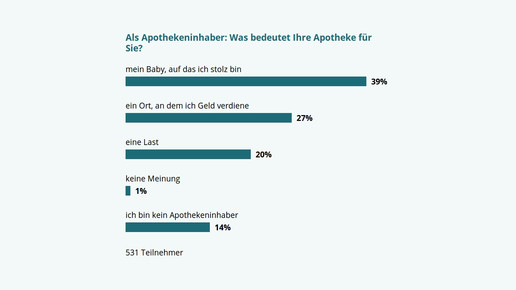 Drei von zehn Apothekeninhabern sehen das Ganze pragmatischer: Für sie ist die Apotheke lediglich der Ort, an dem sie ihren Lebensunterhalt verdienen. Für 23 Prozent der Apothekeninhaber ist die Apotheke vor allem eine Last. 1 Prozent hatte keine Meinung.
