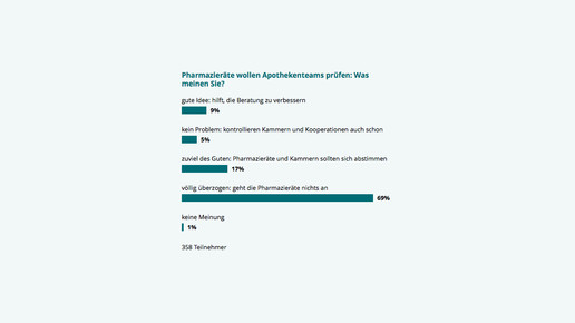 69 Prozent der Teilnehmer finden die angekündigten Prüfungen völlig überzogen: Das Thema Beratung gehe die Pharmazieräte schlichtweg nichts an, so der Tenor. 17 Prozent finden den Vorstoß der Pharmazieräte „zuviel des Guten“: Sie sollten sich zumindest mit den Kammern abstimmen.