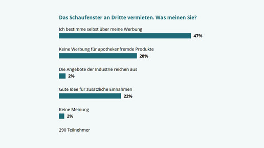 47 Prozent gaben an, die Werbung im Schaufenster selbst zu wählen. 28 Prozent möchten außerdem nicht auf apothekenfremde Produkte hinweisen. Etwa jeder fünfte Teilnehmer findet die Idee gut: Durch das Vermieten der Flächen könnten zusätzliche Einnahmen erzielt werden.