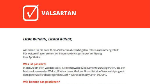 Seit dem 6. Juli dreht sich in Apotheken alles um Valsartan, denn im Durchschnitt kommt der Blutdrucksenker pro Apotheke mindestens einmal am Tag vor. Viele Diskussionen mit verunsicherten Kunden sind die Folge der Rückrufe. Für Ihre Kunden haben wir zum Thema Valsartan die wichtigsten Fakten zusammengestellt – hier können Sie das PDF downloaden, das Dokument ausdrucken und den Patienten mitgeben!
