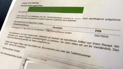 Denn die Kundin hielt ein DocMorris-Schreiben mit einer Absage in der Hand. Das Antidiabetikum Komboglyze (Saxaglitpin, Metformin) von AstraZeneca sei „innerhalb der gesetzlich vorgeschriebenen Lieferfrist nicht lieferbar“, stand dort zu lesen und weiter: „Wie telefonisch besprochen, streichen wir deshalb die betroffenen Artikel von Ihrem Rezept.“ DocMorris bemühe sich, diesen „Engpass schnellstmöglich zu beheben“. „Bis dahin bitten wir um ihr Verständnis.“