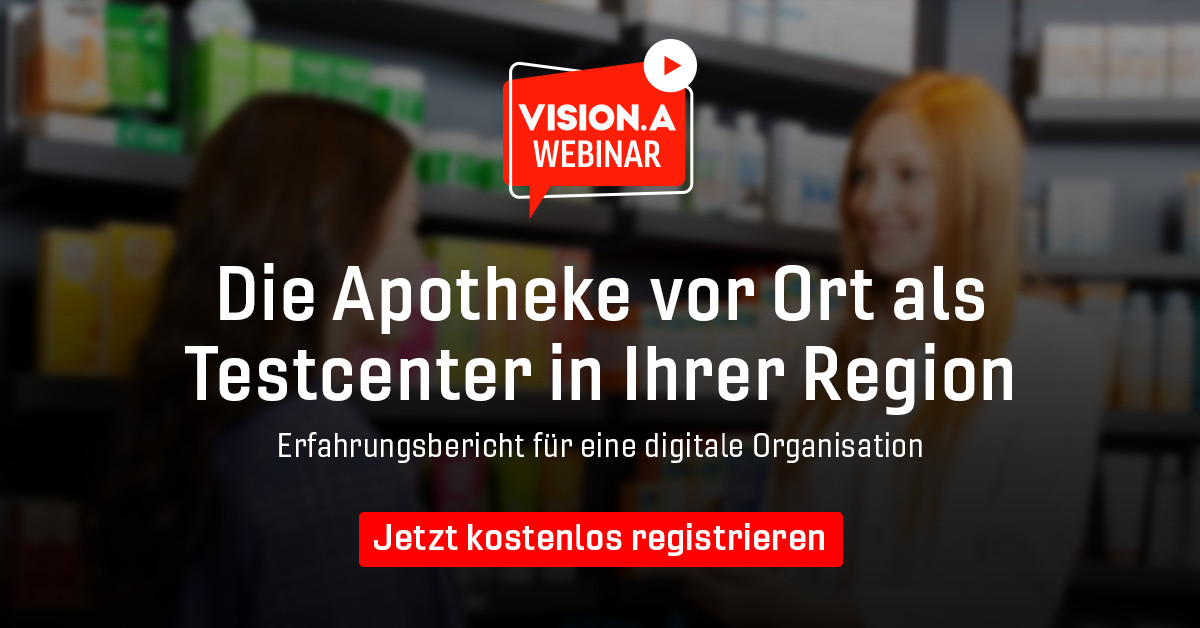 Schnelltests auf Covid-19 in Apotheken sind gefragt. Die neue digitale Format-Reihe VISION.A Webinar ist am Puls der Zeit und startet heute mit Experten zu diesem Thema: Den Auftakt machen DoctorBox-COO Julian Maar sowie die Apotheker Kay Klindwort und Dr. Björn Schittenhelm. Erklärt wird beispielsweise, wie Bezahlung und Abrechnung laufen. VISION.A Webinar informiert im Livestream, wie es funktioniert.