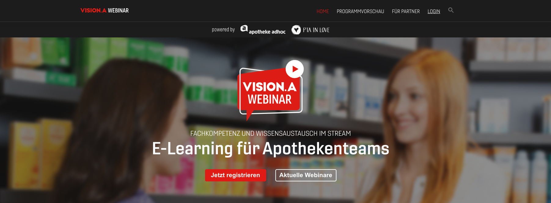 VISION.A Webinar ist das kostenlose E-Learning-Angebot für Apothekenteams – powered by APOTHEKE ADHOC und PTA IN LOVE. Die Registrierung ist 24/7 unter webinar.apotheke-adhoc.de möglich.