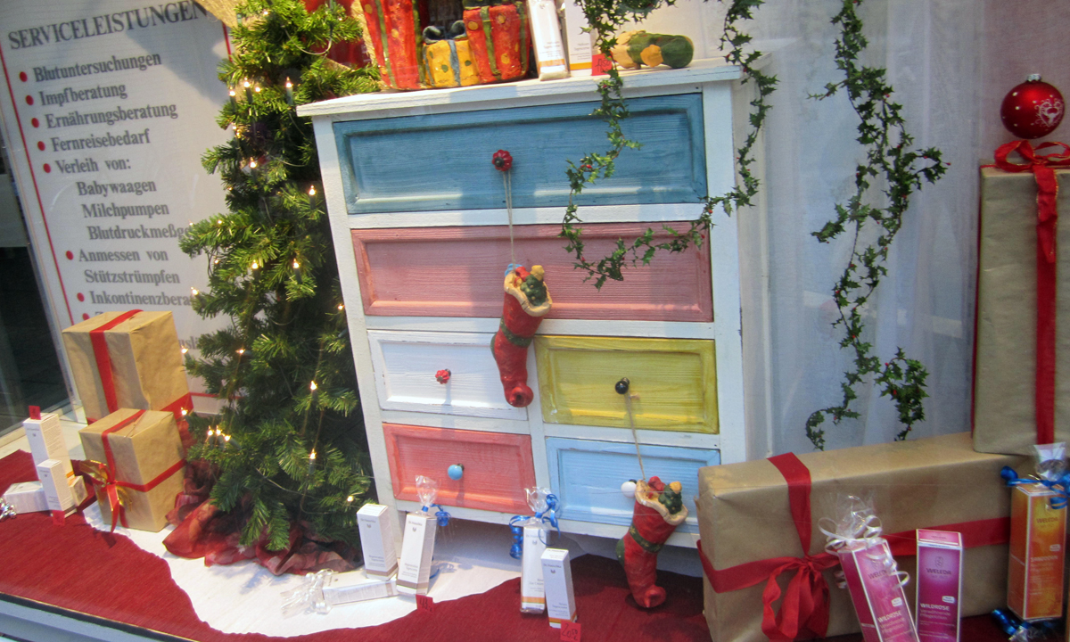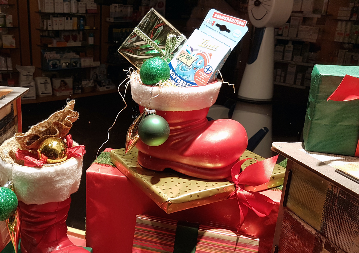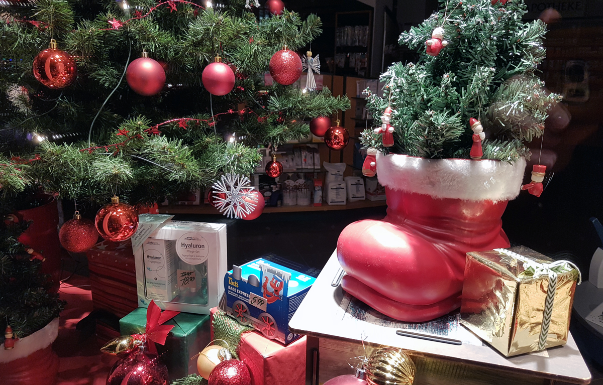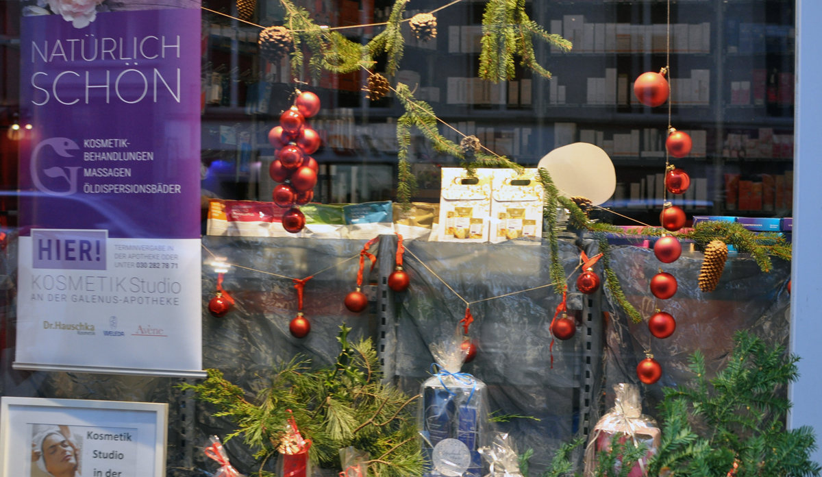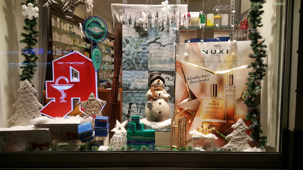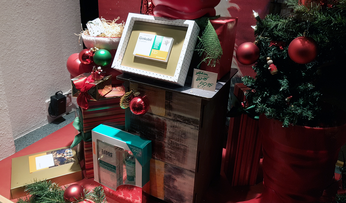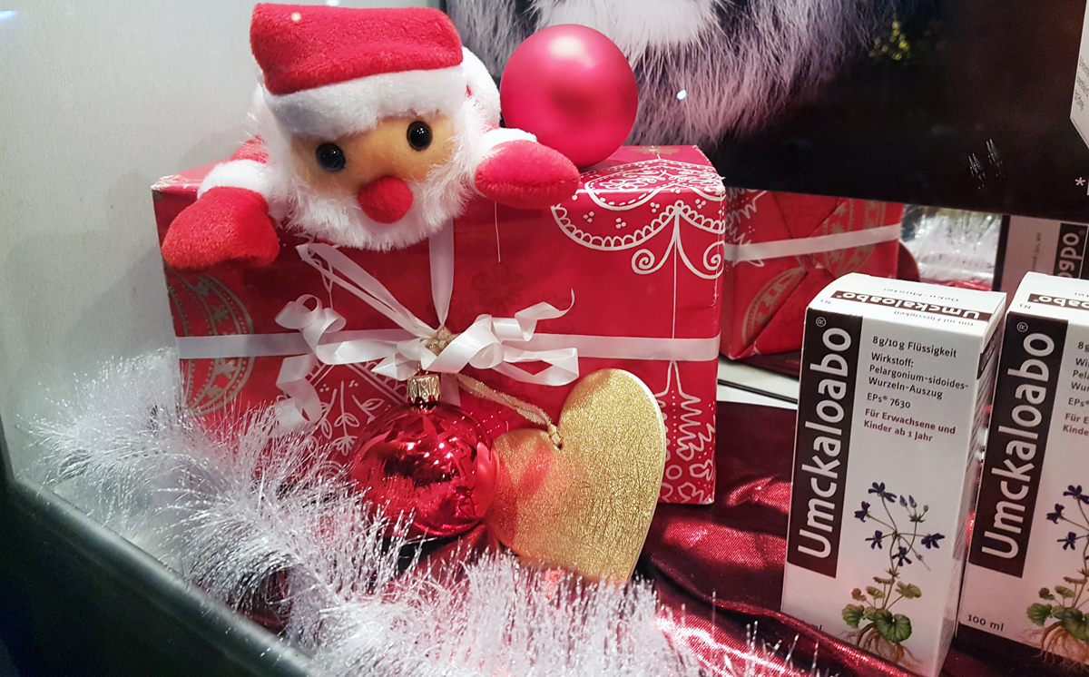 Nicht nur die Produkte selbst sollen zu Weihnachten die Kunden in die Apotheken locken, sondern auch die Dekoration. Da fahren Bimmelbahnen im Schaufenster, Rentiere und Weihnachtsmänner sorgen ebenfalls vielerorts für die richtige Stimmung. Mittendrin werden wahlweise Erkältungspräparate oder Geschenkideen wie Kosmetika zur Schau gestellt. Wie die Kollegen – zum Teil mit eifriger Unterstützung der Hersteller – ihre Auslagen dekorieren, sehen Sie hier!