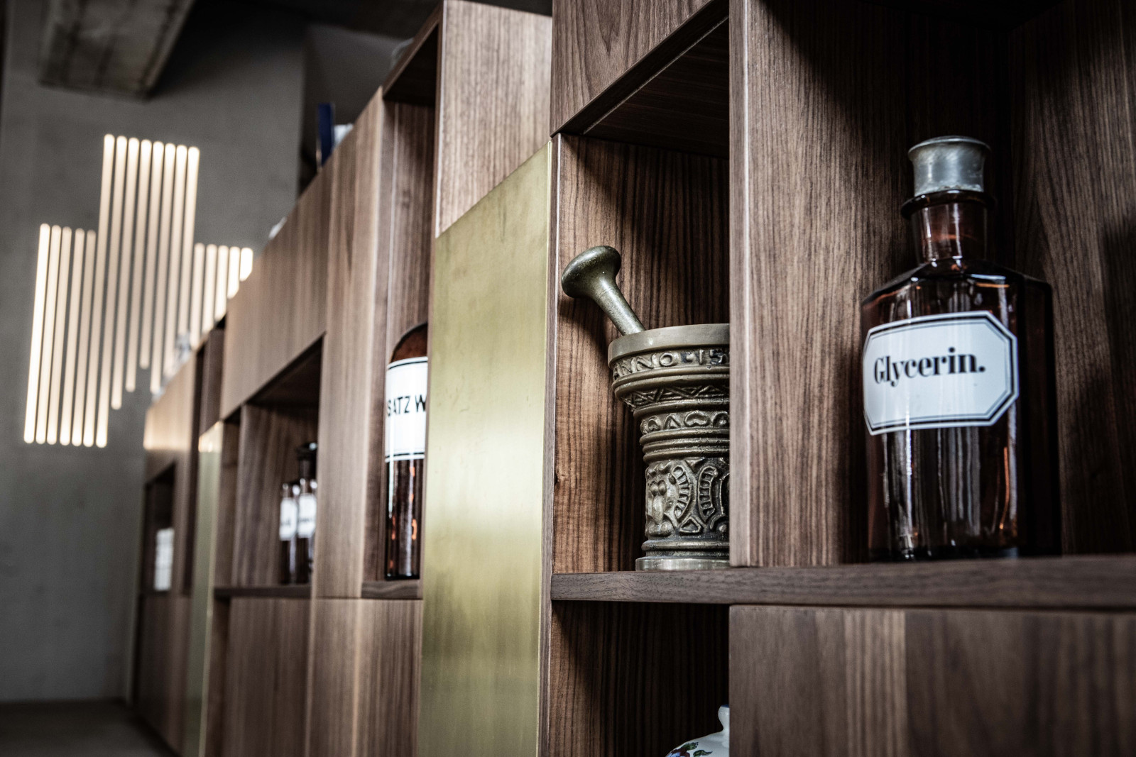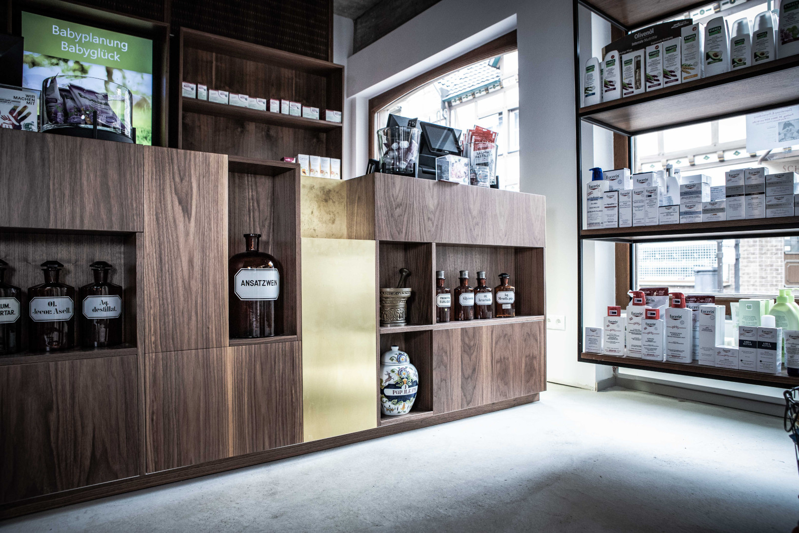 Wnendt spielte schon lange mit dem Gedanken, die Apotheke umbauen zu lassen. „Wir wollten keine 08/15 Lösung von Apothekenausstattern.“ Ganz individuell sollte die „Erneuerung“ sein: Nach langer Überlegung entschied sich die 48-Jährige gemeinsam mit Architektin Tereza Nesemann von Berlin Homestaging für ein innovatives Designkonzept im „Industrial Style“. Die Einrichtung ist nun eher apothekenuntypisch und sehr reduziert. Es wurden viele organische Materialien wie Nussbaum und Messing verwendet. Die Rohbetondecke kam beim Abreißen der Deckenverkleidung unerwartet zum Vorschein. Schnell war klar: Die „trendige“ Decke bleibt. Viele Kunden wundern sich zunächst und auch der Estrichboden sei für viele erstmal verwirrend.