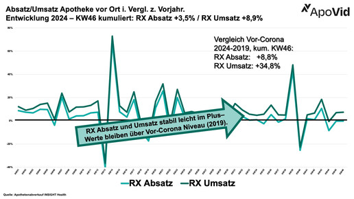 Der Absatz von Rx-Medikamenten ist mit einem Plus von 3,5 Prozent im Vergleich zum Vorjahr gestiegen, der Umsatz legte um 8,9 Prozent zu. Hier konnten Absatz und Umsatz im Vergleich zum Vor-Corona-Niveau gesteigert werden: Die Zahl der abgegebenen Packungen stieg hier um 8,8 Prozent, der Umsatz aufgrund der Zunahme von Hochpreisern sogar um 34,8 Prozent.