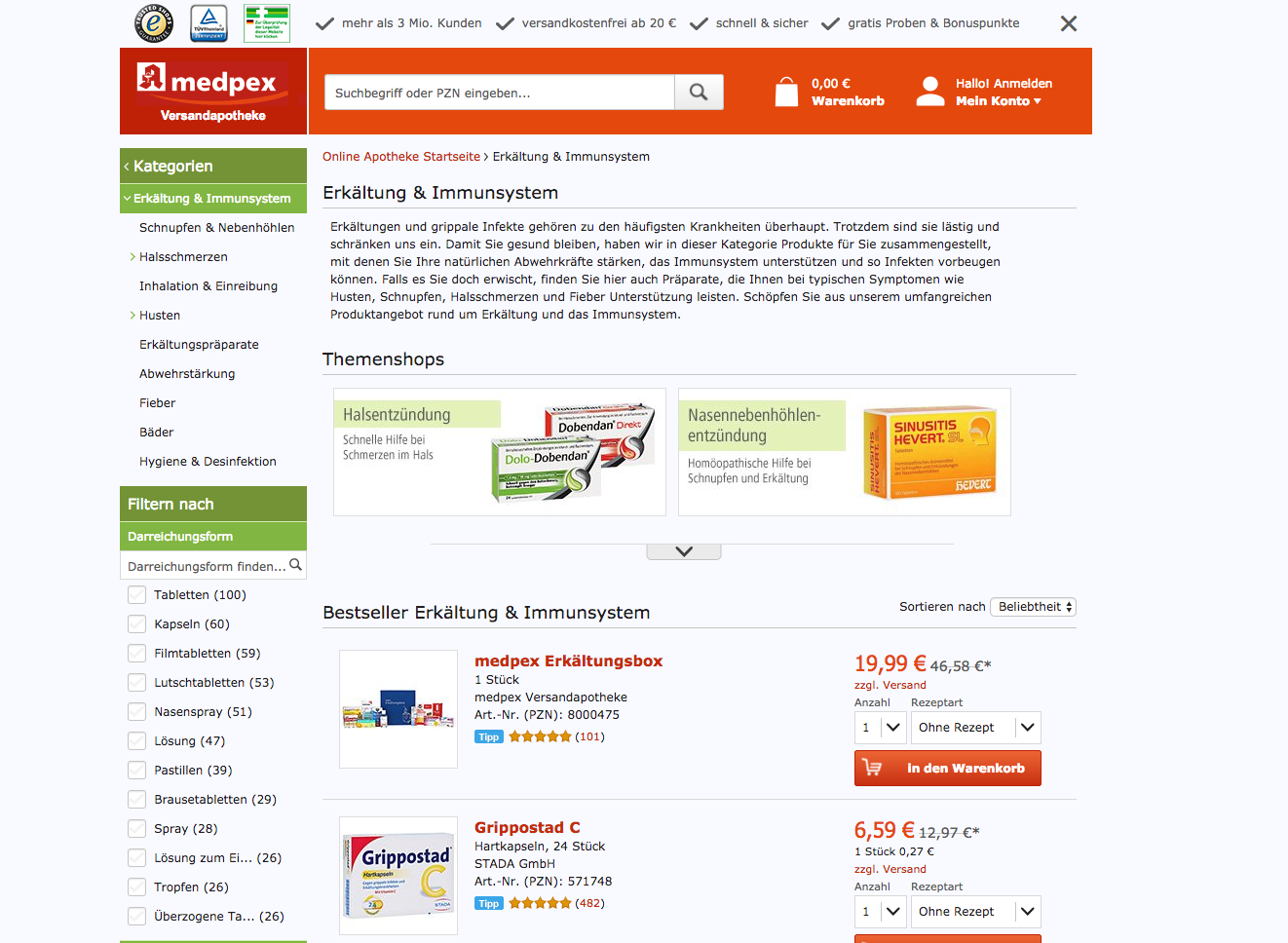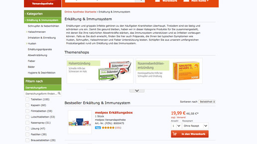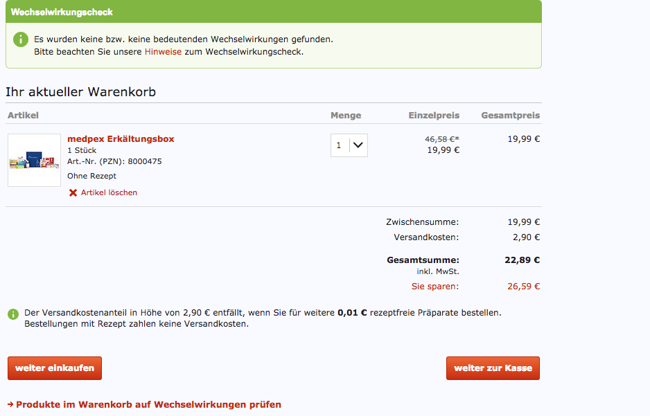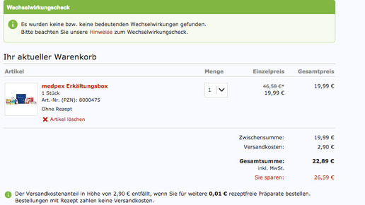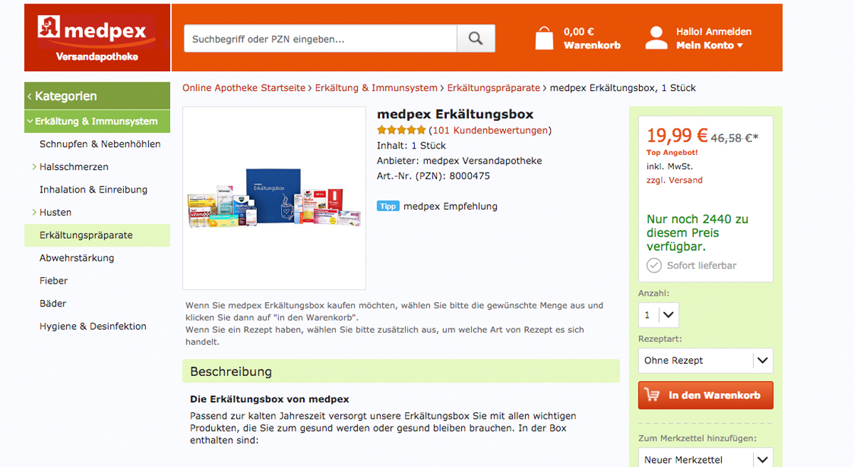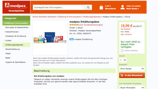 Für 19,99 Euro gibt es elf Produkte in einer Bevorratungsbox, „um Sie durch die ganze Erkältungszeit zu bringen“. Der Listenpreis ist mit 46,58 Euro angegeben. Allerdings werden Versandkosten in Höhe von 2,90 Euro fällig; ein Hinweis erklärt, dass man weitere rezeptfreie Präparate bestellen kann, um die Versandkosten zu sparen. Tatsächlich liegt der Preis der Box nur einen Cent unter dem versandkostenfreien Mindestbestellwert.