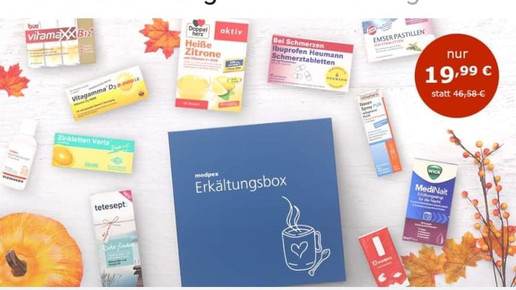Gesund durch den Winter für 20 Euro? Medpex hat für seine Kunden ein Paket geschnürt: „Passend zur kalten Jahreszeit versorgt unsere Erkältungsbox Sie mit allen wichtigen Produkten, die Sie zum gesund werden oder gesund bleiben brauchen.“ Gefüllt mit Nahrungsergänzungsmitteln, Taschentüchern, aber auch Arzneimitteln verspricht die Box eine erkältungsfreie Winterzeit.