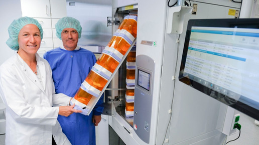 Eine Herstellung kann vor Ort erfolgen, da die Wege von der Klinikapotheke bis zum Impfzentrum kurz sind. Zwar liegt die Klinikapotheke in einem separaten Gebäude, doch dieses ist nur durch einen kurzen Gang vom Haupthaus getrennt. „Es ist nur ein kurzer Weg innerhalb des Klinikums von der Apotheke bis ins Impfzentrum. Mit passenden Kühlboxen, die wir auch vorher schon für andere spezielle Transporte auf dem Gelände verwendet haben, können wir die aufgezogenen Spritzen rüber ins Impfzentrum bringen.“