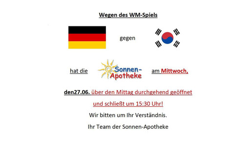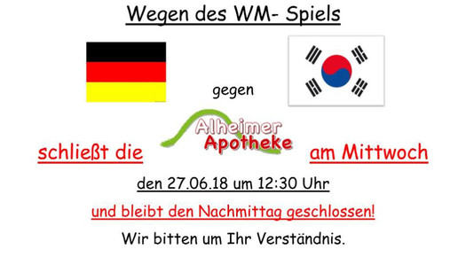 Und so wird die Sonnen-Apotheke in Niederaula am heutigen Mittwoch auch während der Mittagspause für die Kunden da sein, dafür aber bereits um 15.30 Uhr schließen. Ähnlich wird es in Hangens Schloss-Apotheke in Eschwege gehandhabt. In der Alheimer-Apotheke geht es sogar noch früher in den Feierabend. Bereits um 12.30 Uhr können die Mitarbeiter den Weg nach Hause, zu Freunden oder zum Public Viewing antreten.