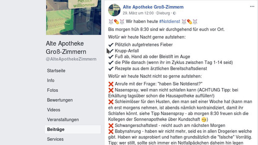 Wofür darf ein Notdienst in Anspruch genommen werden und wann sollte ein nächtlicher Gang zur Apotheke besser überdacht werden? Daniela von Nida, Inhaberin der Alten Apotheke im hessischen Groß-Zimmern, hat auf Grundlage eigener Erfahrungen ein paar goldene Regeln in einem Facebook-Post für ihre Kunden zusammengefasst.