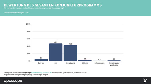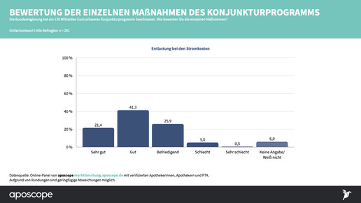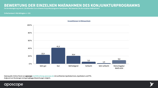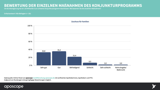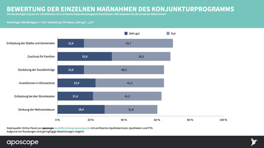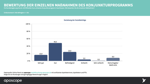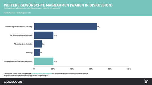 Einige zuvor diskutierte Maßnahmen haben es nicht ins Konjunkturpaket geschafft – allen voran die umstrittene „Abwrackprämie“ für alte Autos. Dafür hätte es in Apotheken offenbar auch nicht besonders viel Zustimmung gegeben: Nur 8 Prozent der Befragten gaben an, dass sie sich eine Abwrackprämie gewünscht hätten. Dagegen vermissen zwei Drittel der Befragten eine Abschaffung des Solidaritätszuschlags. Immerhin jeder Fünfte hätte sich eine Verlängerung des Kurzarbeitergelds gewünscht.
