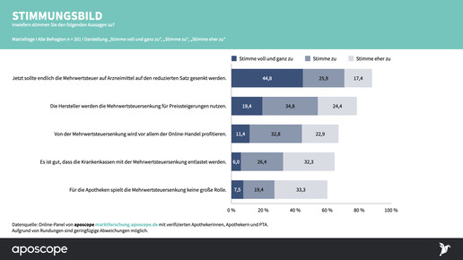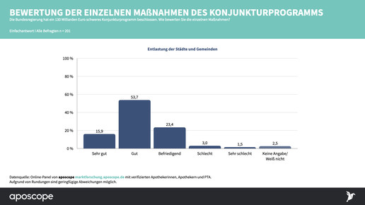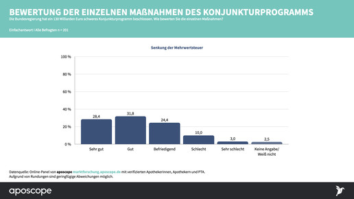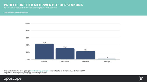 Größte Profiteure werden aus Sicht der Teilnehmer (43 Prozent) aber die Händler sein. Zwei Drittel befürchten, dass vor allem der Onlinehandel mit seiner preissensitiven Klientel von der Mehrwertsteuersenkung profitieren wird. Für die Apotheken spielt die Mehrwertsteuersenkung aus Sicht der Mehrheit der Befragten keine besonders große Rolle (60 Prozent). Tatsächlich ist die Umsatzsteuer beim gesamten Rezeptumsatz ohnehin ein durchlaufender Posten.