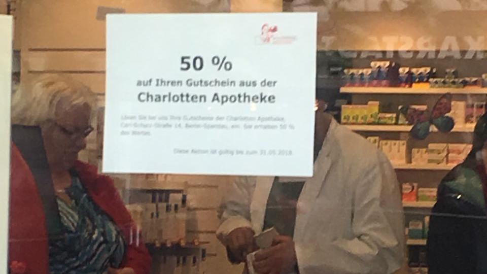 Dort tauchte zur gleichen Zeit ebenfalls ein Aushang im Schaufenster auf: „50 Prozent auf Ihren Gutschein aus der Charlotten Apotheke“, hieß es da. „Lösen Sie bei uns Ihre Gutscheine der Charlotten Apotheke ein. Sie erhalten 50 Prozent des Wertes.“ Außerdem wurde darauf verwiesen, dass die Aktion bis Ende Mai gültig ist.