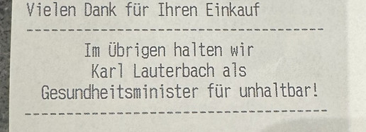Das empörte den Journalisten derart, dass er den Bon kurzum auf X postete und kommentierte: „… und ich halte politische Statements auf Kassenbons für untragbar. Meine Apotheke in Berlin, gestern“, echauffiert er sich. Vertaggt sind neben APOTHEKE ADHOC zusätzlich die Apotheken-Umschau und Bundesgesundheitsminister Karl Lauterbach (SPD).
