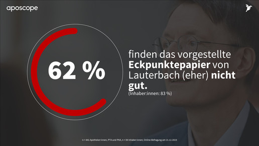 62 Prozent der von aposcope Befragten sehen das Eckpunktepapier negativ – bei den Inhaber:innen sind es 83 Prozent, bei den angestellten Approbierten 79 Prozent, bei PTA 45 Prozent und bei PKA 50 Prozent.