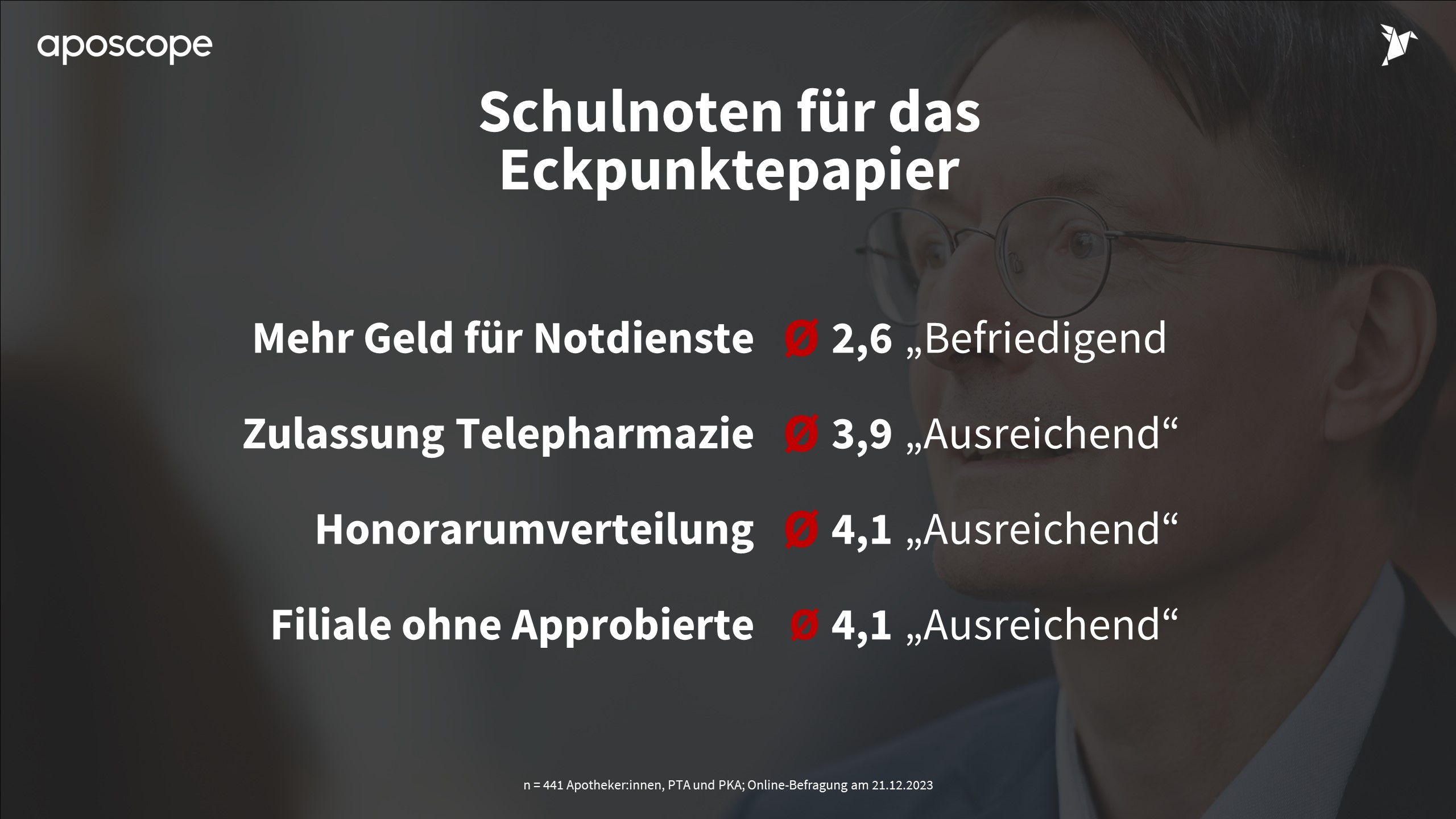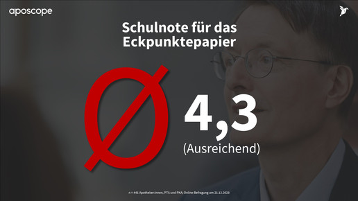 Mit der Note „5,29“ fallen Lauterbachs Eckpunkte bei den Inhaberinnen und Inhabern rasselnd durch. Auch die angestellten Approbierten vergaben bei einer aposcope-Befragung ein „Mangelhaft“. Etwas besser fällt das Zeugnis mit „Ausreichend“ bei PTA und PKA aus – allerdings vergeben diese beiden Berufsgruppen bei Umfragen tendenziell leicht bessere Noten.