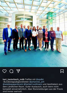 Mit etwas Verspätung traf Lauterbach zum Gespräch um kurz nach 13 Uhr ein – blieb aber für die versprochene Stunde. Neben den Wahlkreisabgeordneten Johannes Arlt, Wiebke Papenbrock und Herbert Wollmann, die zehn Apothekerinnen und Apotheker zum Gespräch geladen hatten, war auch der für die Reform zuständige Abteilungsleiter Thomas Müller anwesend.