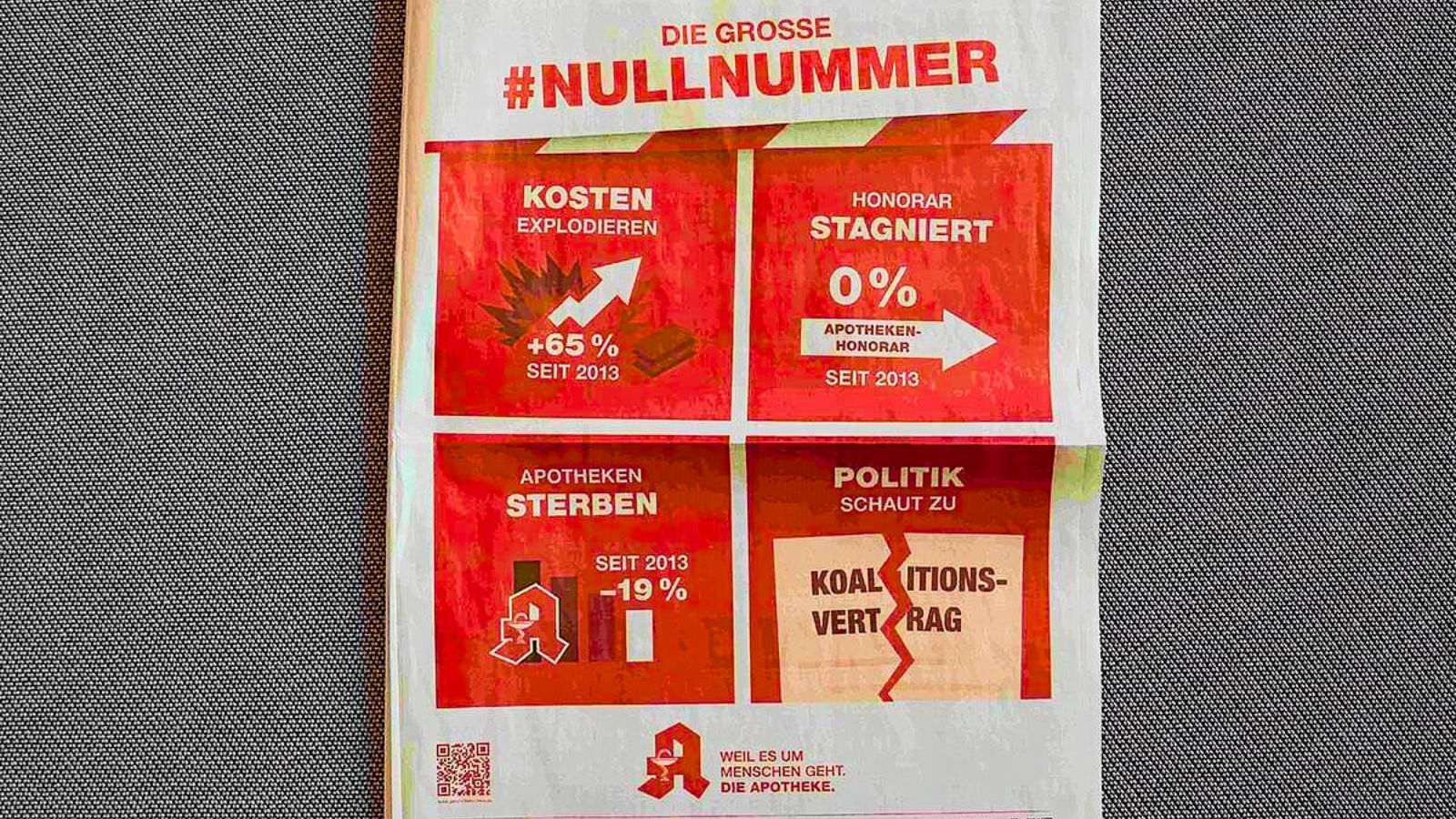 „Sofort springt den Leserinnen und Lesern ins Auge, warum die Apotheken wirtschaftlich gestärkt werden müssen. Kurz und knapp wird mit der Anzeige erklärt: Die Kosten explodieren, das Honorar stagniert, die Apotheken sterben und die Politik schaut zu“, informiert die Abda heute. Hinzu kommen noch der Hashtag „Nullnummer“ und ein QR-Code zur passenden Abda-Infoseite gesundheitsichern.de.