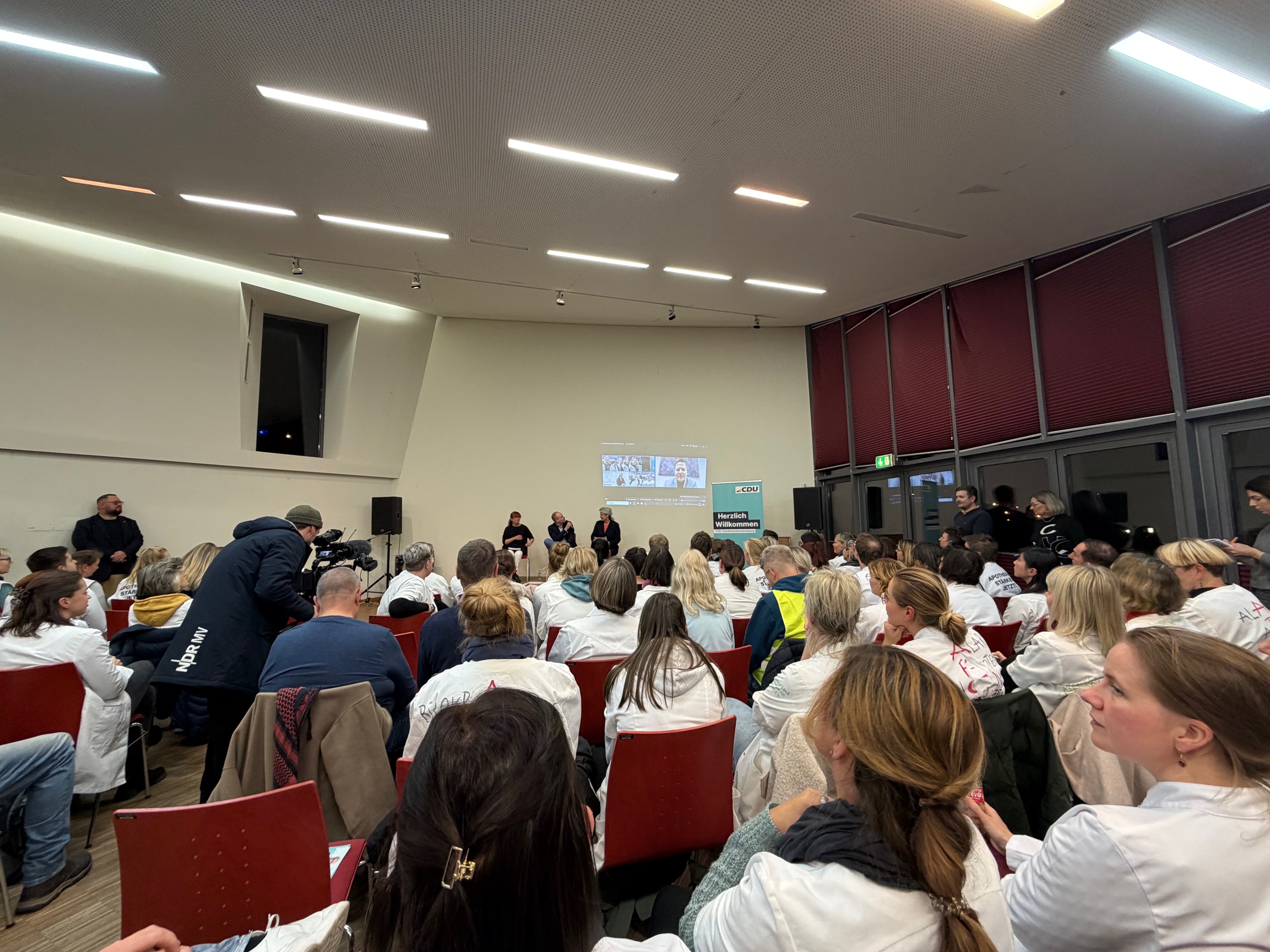 Die Apotheker:innen sind zum Großteil mit Kitteln bekleidet zur Diskussionsveranstaltung in den Luise-Reuter-Saal nach Grevesmühlen gekommen. Sorge, der für ein Grußwort zugeschaltet war, gab ein „klares Bekenntnis für die Apotheke vor Ort“.