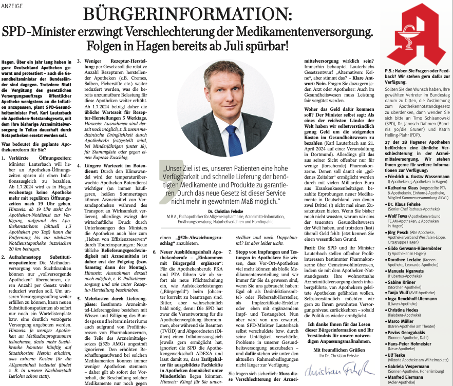 Seine Botschaft: Schuld an den Folgen sei der SPD-Minister. Der Mann, der öffentlich damit prahle, dass man als eines der reichsten Länder der Welt genug Geld für steigende Kosten im Gesundheitswesen habe, aber den Apotheken nichts honorieren will, so Fehske in der Anzeige. Er verweist auch klar an die Zuständigkeiten und nennt Bundestagsmitglieder der SPD, der FDP und der Grünen, bei denen man sich bitte beschweren und ein Umdenken einfordern solle.