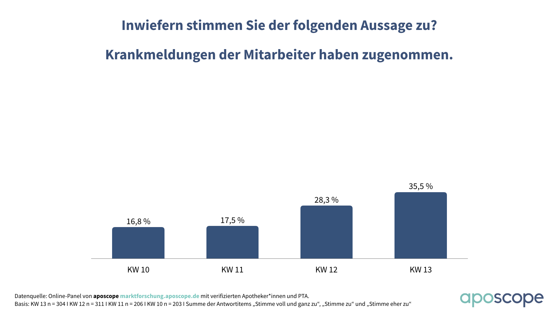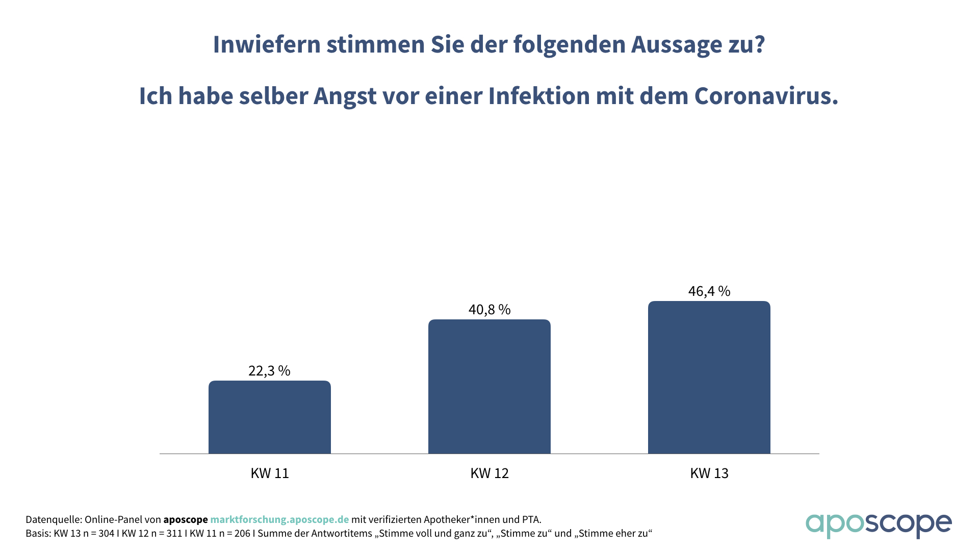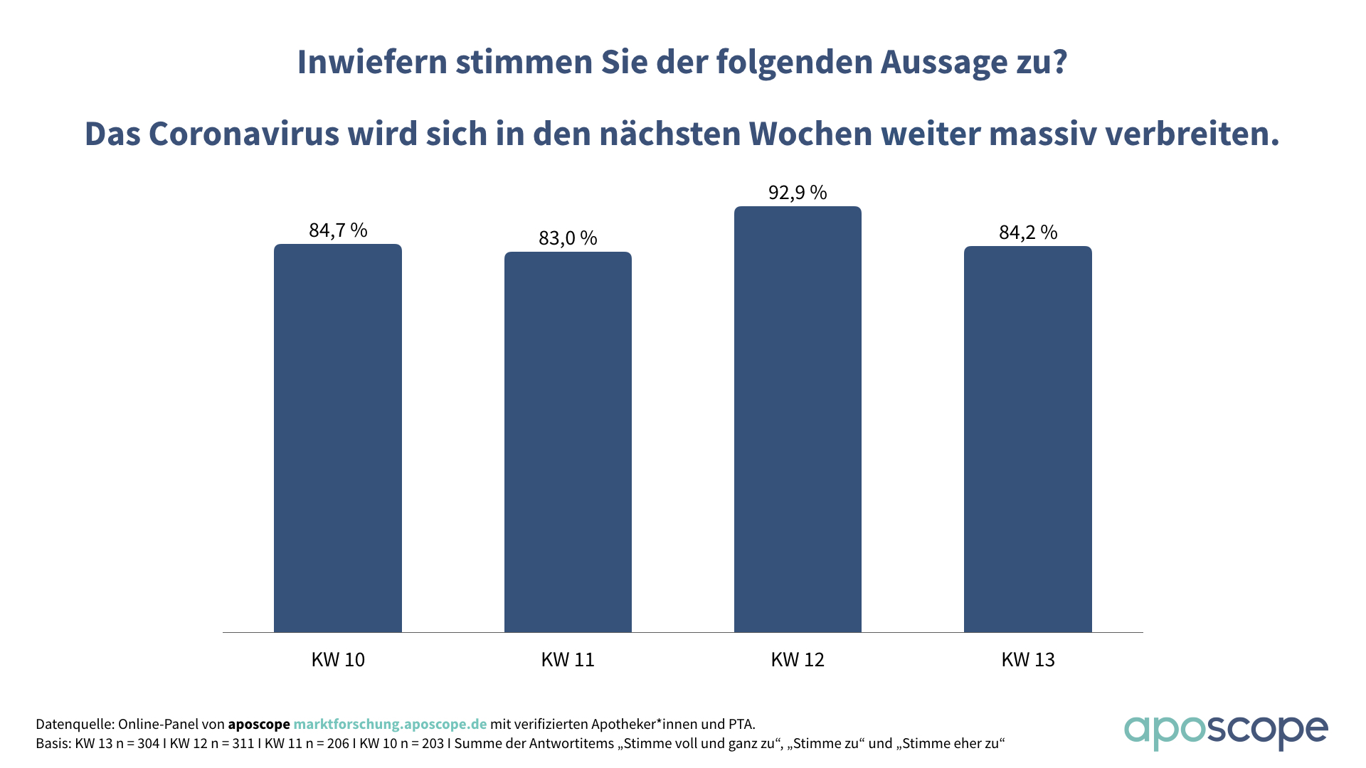 Das änderte sich aber schlagartig eine Woche später. In der nächsten Kalenderwoche stieg der OTC-Absatz in den Apotheken bereits um 22,6 Prozent. In der 10. Kalenderwoche normalisierte sich der Absatz wieder auf ein Plus von 4,9 Prozent gegenüber dem Vorjahreszeitraum, bevor eine Woche später der Run auf die Apotheken einsetzte: In der 11. Kalenderwoche verbuchten die Apotheken einen nie dagewesenen Absatzsprung von knapp 60 Prozent gegenüber dem Vorjahr.