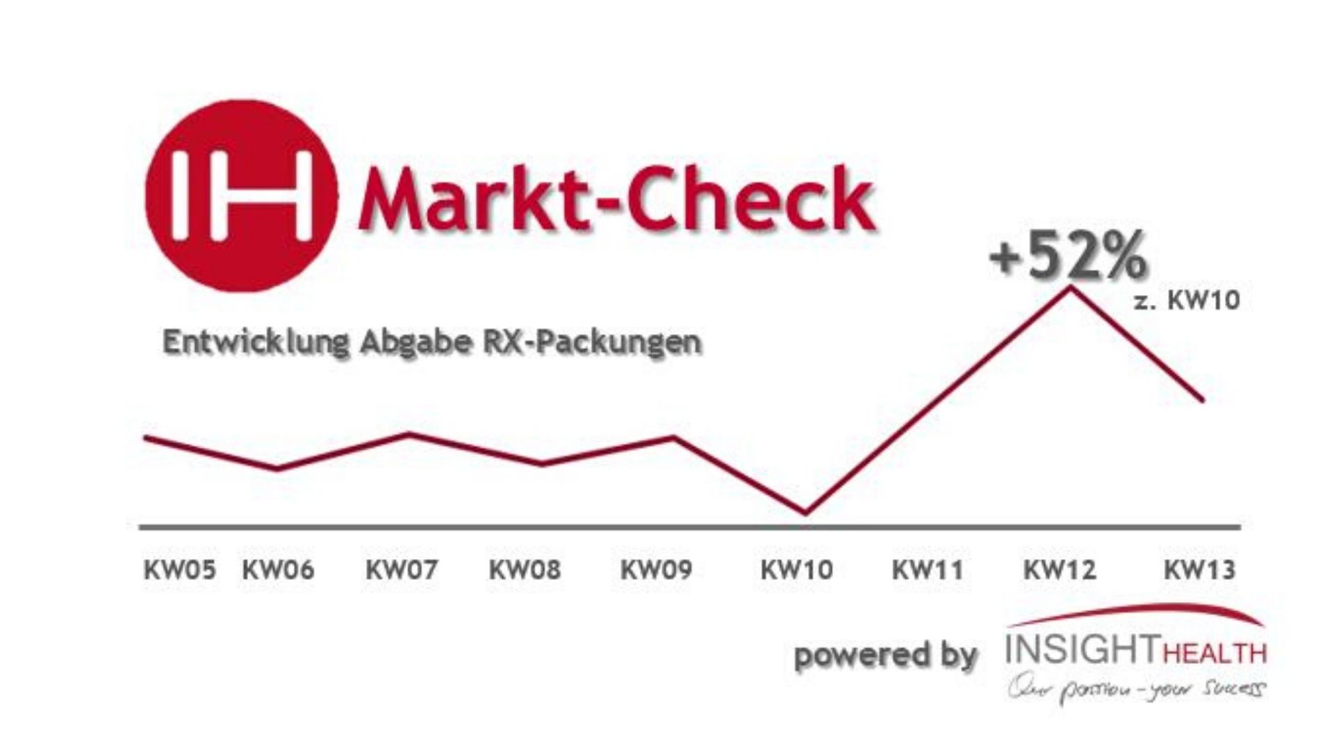 Nach Angaben von Insight Health explodierte der Rx-Absatz in der dritten Märzwoche um 52 Prozent gegenüber der ersten Märzwoche. Einen solchen Anstieg gab es noch niemals zuvor. Allerdings sank in der vierten Märzwoche der Rx-Absatz wieder, lag aber immer noch klar über dem Vorjahreswert. Laut Insight Health zeigt sich darin der oft beschriebene Vorzieheffekt: Insbesondere Chroniker versorgten sich angesichts der heraufziehenden Corona-Krise zum Quartalsende nochmals mit den notwendigen Arzneimitteln.