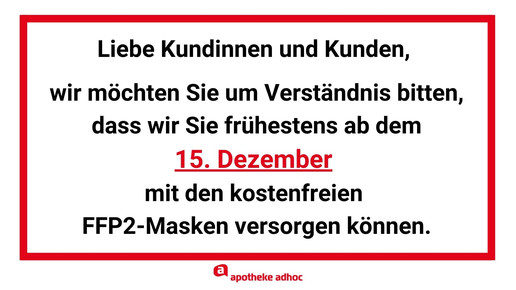 In den Apotheken ist die Nachfrage nach den kostenfreien FFP-Masken seit der Bekanntgabe immens. Zur Unterstützung können Sie die Vordrucke herunterladen, ausdrucken und aufhängen.