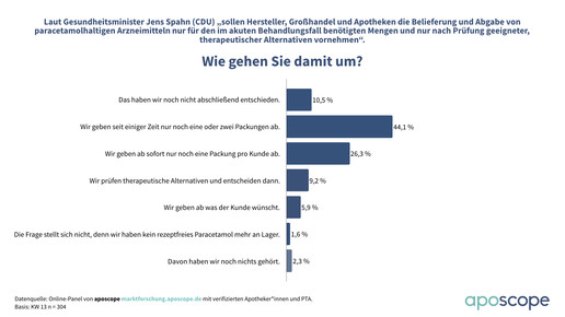 Um die Folgen der Lieferengpässe sowie der gestiegenen Nachfrage nach einigen Produkten abzufedern, hat die Politik bereits eine Rationierung bestimmter Arzneimittel – vor allem von Paracetamol – gefordert. Mehr als ein Viertel der Teilnehmer (26 Prozent) will daher ab sofort nur noch eine Packung pro Kunde abgeben. Weitere 44 Prozent der Befragten geben an, bereits seit einiger Zeit maximal ein bis zwei Packungen des Arzneimittels zu verkaufen. Gleichzeitig haben viele Apotheken die Preise der derzeit viel gefragten Produkte angezogen – meist schon aufgrund deutlich gestiegener Einkaufspreise. Das gilt etwa für Atemschutzmasken und Desinfektionsmittel, aber auch Paracetamol und Fieberthermometer.