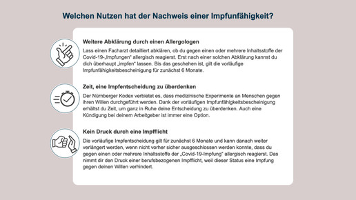 „Bist du überhaupt impffähig?“ Das ist die Frage, um die sich Bönigs neues Angebot dreht. Die Argumentation ist denkbar simpel: Wer nicht ausschließen kann, gegen einen der Inhaltsstoffe in einem der verfügbaren Covid-19-Impfstoffe allergisch zu reagieren, ist vorläufig impfunfähig. Zur genaueren Abklärung wird an einen Allergologen verwiesen.