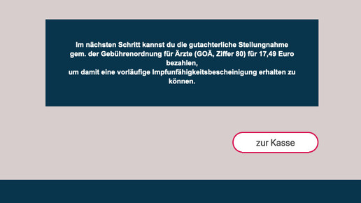 Und die Bescheinigung ist wirklich einfach zu bekommen: Wer online seine Daten eingibt und 17,49 Euro zahlt, gelangt zu einem Video, in dem insbesondere auf die Risiken der Impfung hingewiesen wird. Einen persönlichen Kontakt zu einem Arzt oder einer Ärztin gibt nicht, auch keine sonstige Form der Onlineberatung.