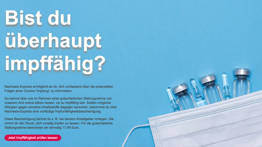 Der Unternehmer Markus Bönig hat in der Corona-Krise ein neues Geschäftsfeld für sich entdeckt: Bei „Nachweis-Express“ können sich Impfskeptiker:innen gegen Bezahlung eine „vorläufige Impfunfähigkeitsbescheinigung“ ausstellen lassen, die beispielsweise vor einer Kündigung in Berufen mit Impfpflicht schützen soll. Eine Ärztin a.D. gibt dazu online eine gutachterliche Stellungnahme ab. Ihre Ärztekammer hat allerdings bereits Strafanzeige gestellt und Bönig Post von der Wettbewerbszentrale erhalten.