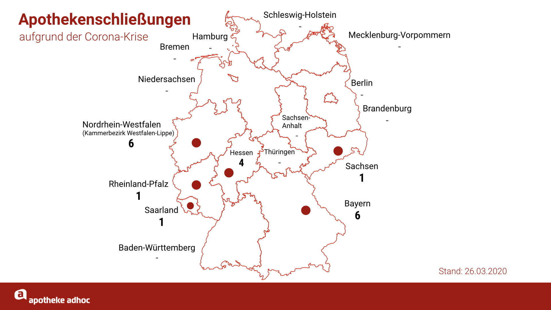 Vor allem Bayern, Hessen und Westfalen-Lippe sind betroffen; das sind nicht nur die größten Kammerbezirke, sondern auch Länder mit hohen Fallzahlen. Überraschend ist dagegen, dass Baden-Württemberg und Nordrhein von Apothekenschließungen bislang verschont wurden. Eine Erklärung könnte der unterschiedliche Umgang der Gesundheitsämter mit entsprechenden Verdachtsfällen sein. Gelegentlich wird das Thema über Auflagen oder Betriebsferien geregelt.